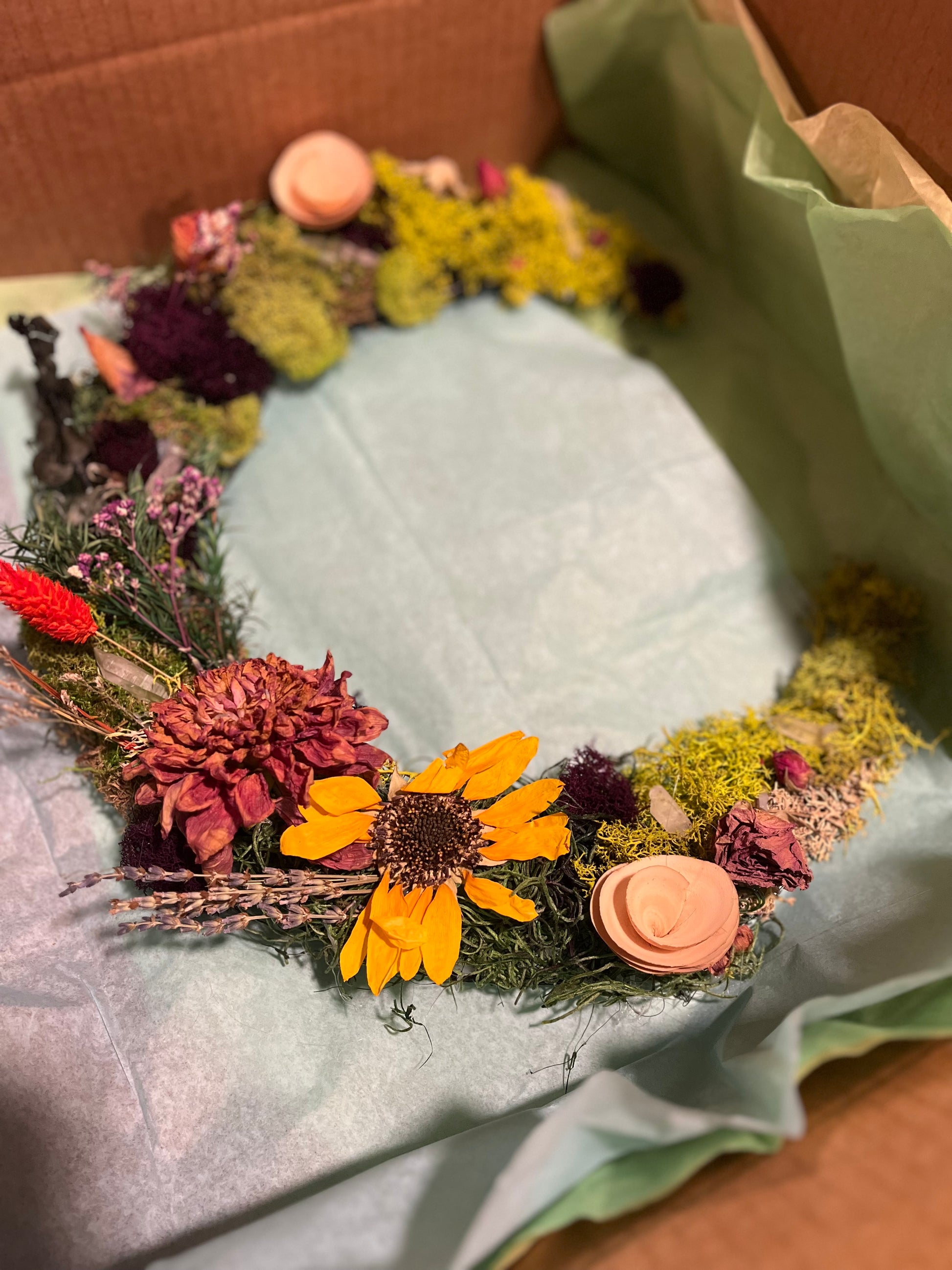 Our wreaths are hand made. They are a made with a rainbow of homegrown and local farm flowers dried in an antique drying rack, delightfully acquired from a farm in Frederick Maryland. The base is of preserved Reindeer and/or Spanish moss.