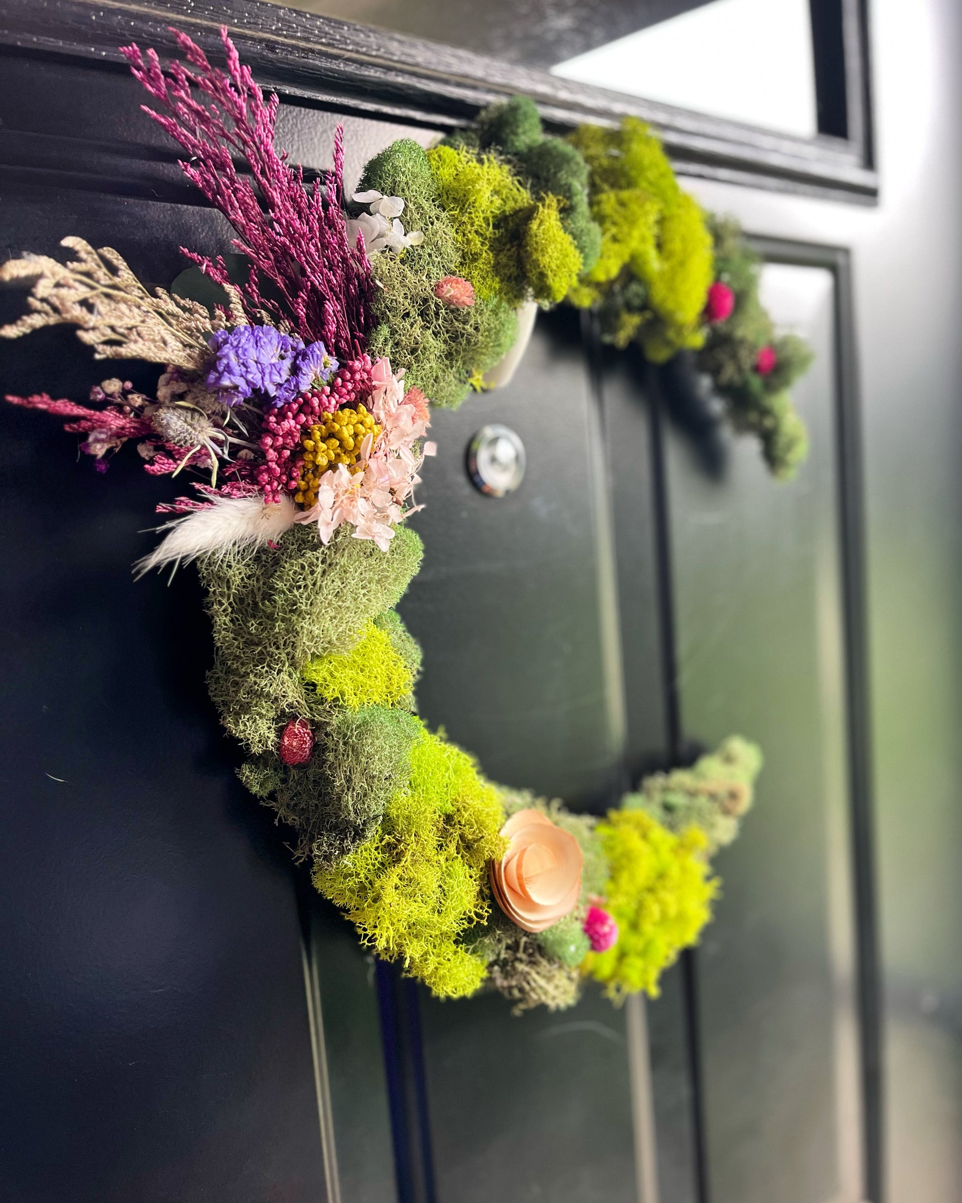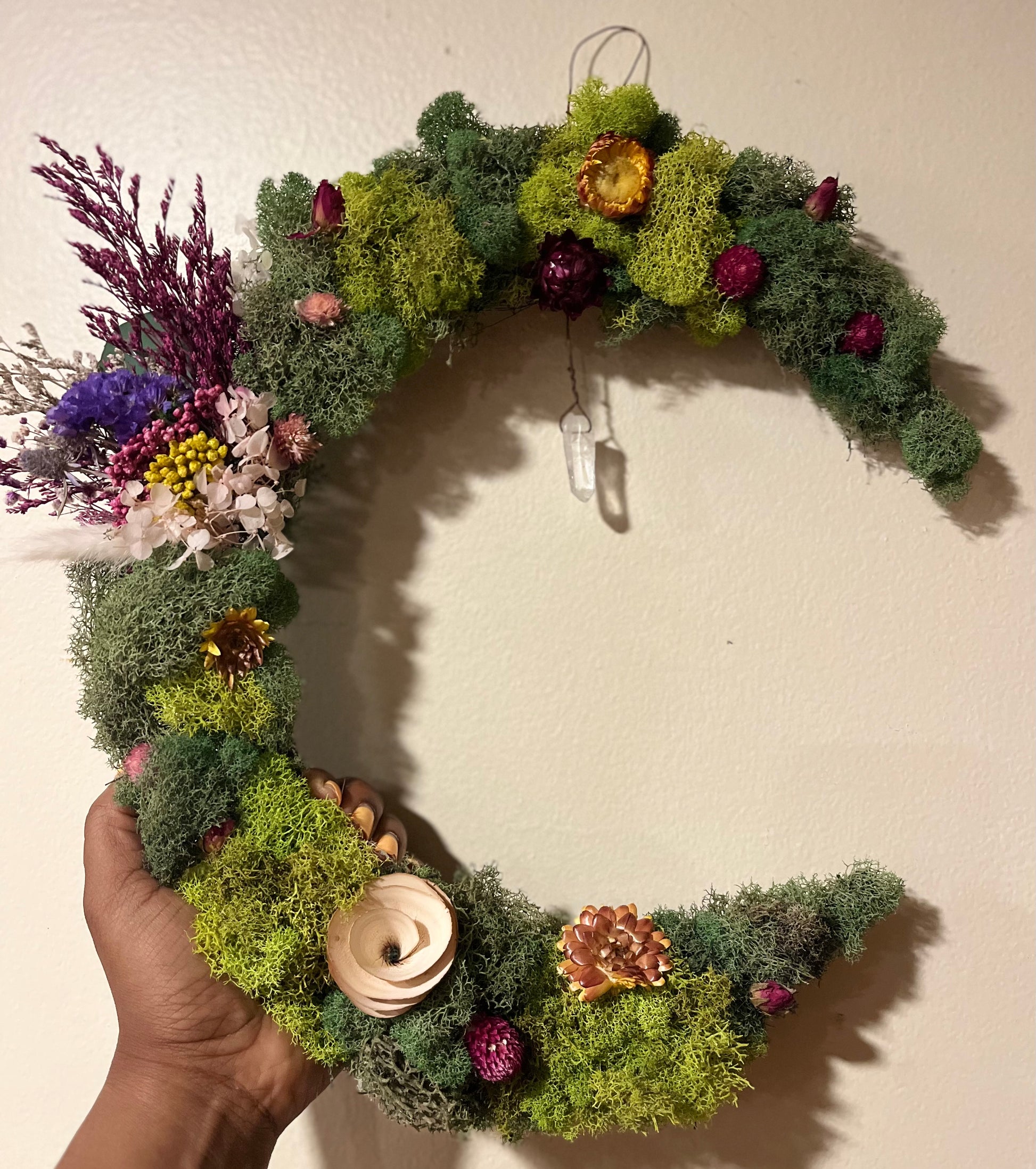 Our wreaths are hand made. They are a made with a rainbow of homegrown and local farm flowers dried in an antique drying rack, delightfully acquired from a farm in Frederick Maryland. The base is of preserved Reindeer and/or Spanish moss. No two wreaths are alike. Each wreath is made to order, with a clear quartz. The product received will be similar but not identical to that pictured.
