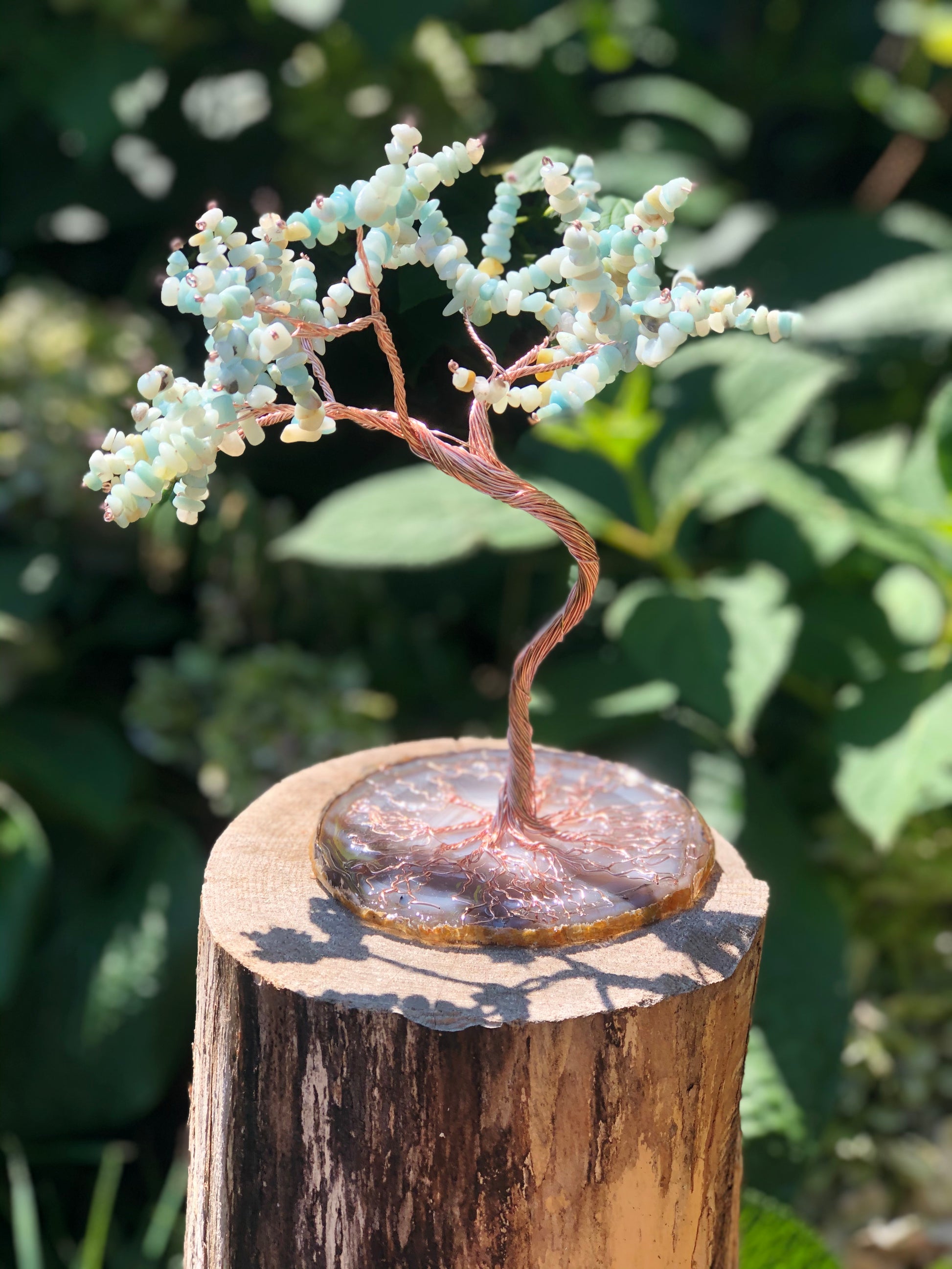 Each tree is handmade and custom, meaning no two are alike you may choose the metal and stone options avaliable or choose the Crytsal Quartz option for the size and finish and discuss your desired color or intention and what stone represents that in the custom text field.