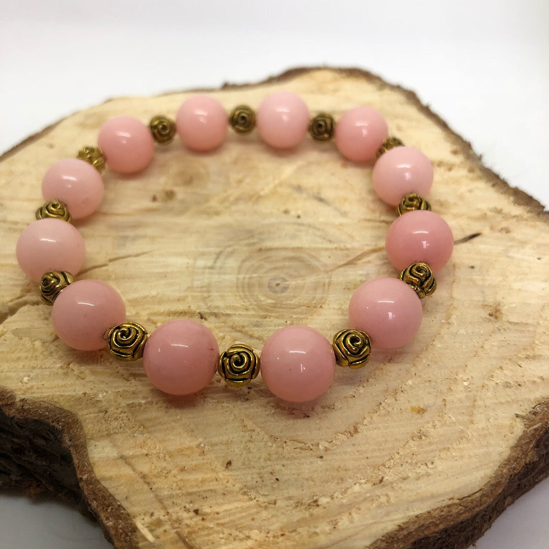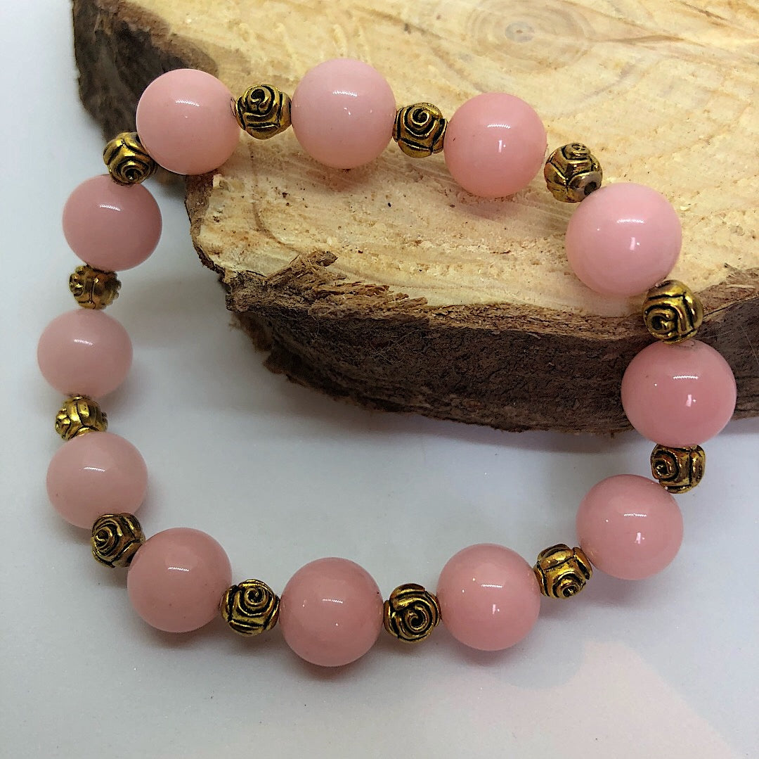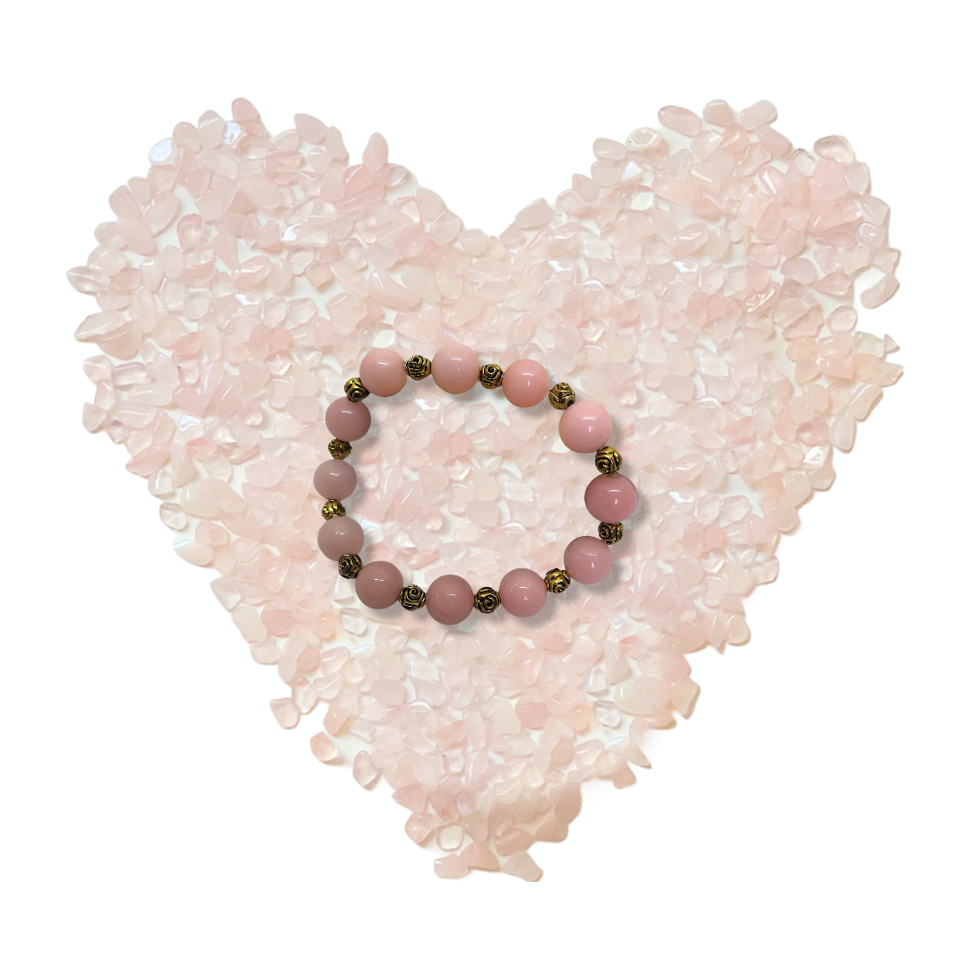 Inspired by the song "La Vie En Rose" which translates to “Life in pink”. This handmade gemstone beaded stretch bracelet is made with rose quartz beads and metal beads detailed with roses.