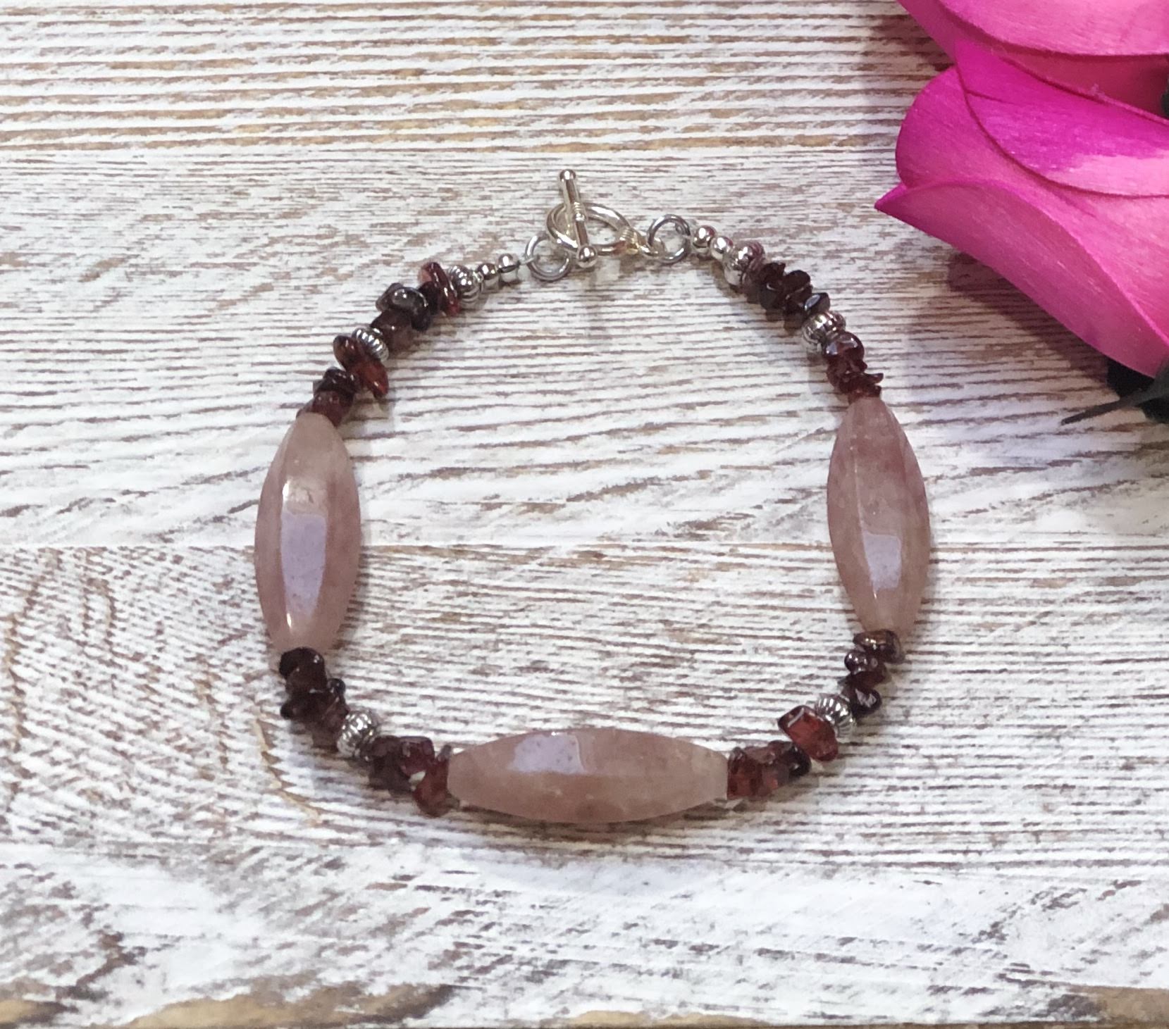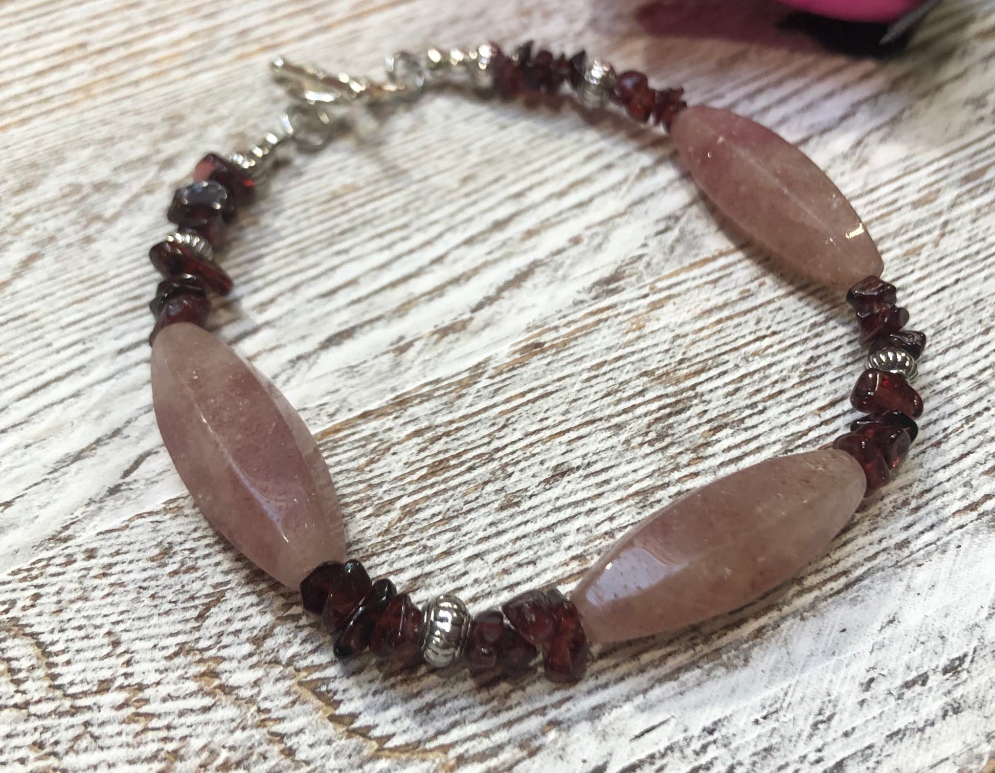 This bracelet of Ruby Quartz and Garnet is inspired by “the finest Garnet Crystal ever found in the United States”. In New York, August 1885 a laborer found a quartzite vein containing the crystal. The large single crystal became known as the “Subway Garnet”.